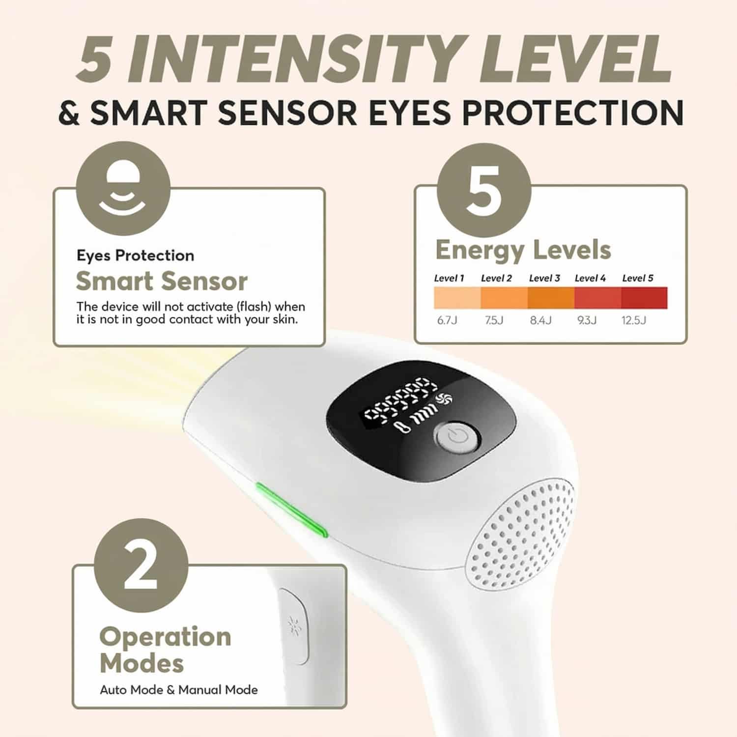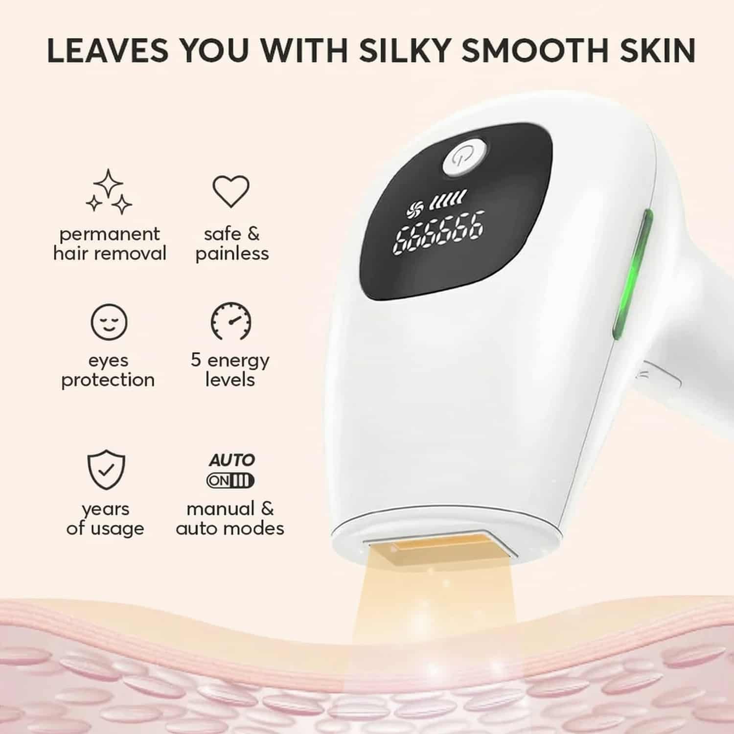 The SilkPulse Pro™ uses the exact same intense pulsed light technology that professional clinics rely on to deliver permanent hair reduction. The built-in skin contact sensor ensures it only fires when properly placed against your skin, 5 adjustable energy levels let you dial in the perfect comfort for every body area, from legs to bikini line to upper lip, and the integrated LCD display tracks every session so you always know exactly where you are in your treatment cycle.